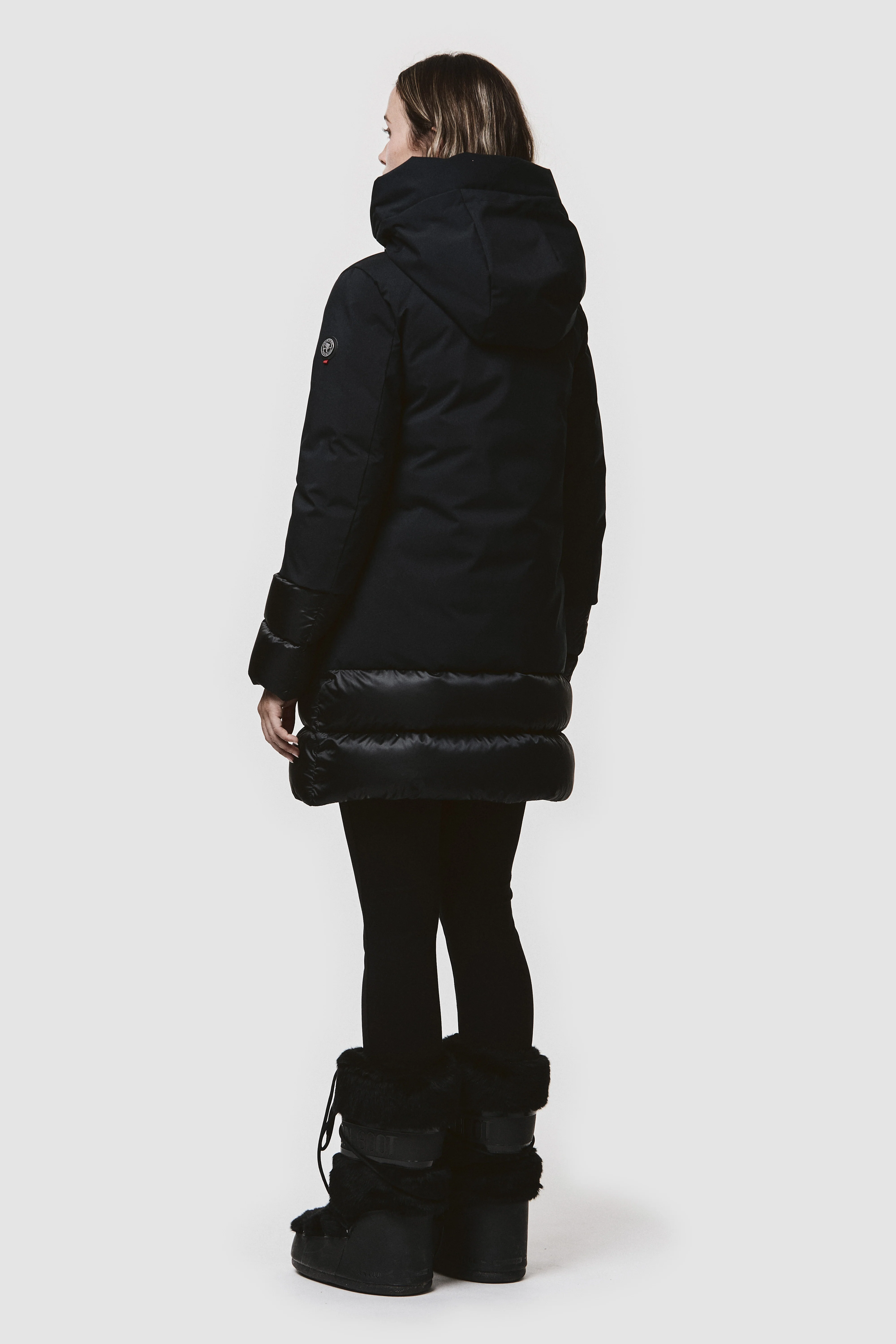 Giacca da donna in tessuto laminato SCUBA impermeabile. Imbottita in piuma naturale, garantisce comfort termico fino a -10°C mantenendo leggerezza e struttura. Zip frontale e tasche con doppio cursore, cappuccio fisso regolabile con coulisse. I dettagli lucidi e trapuntati, posizionati alle estremità della giacca, aggiungono carattere a una linea sobria e contemporanea. Completa il capo una tasca interna portadocumenti, utile negli spostamenti quotidiani.