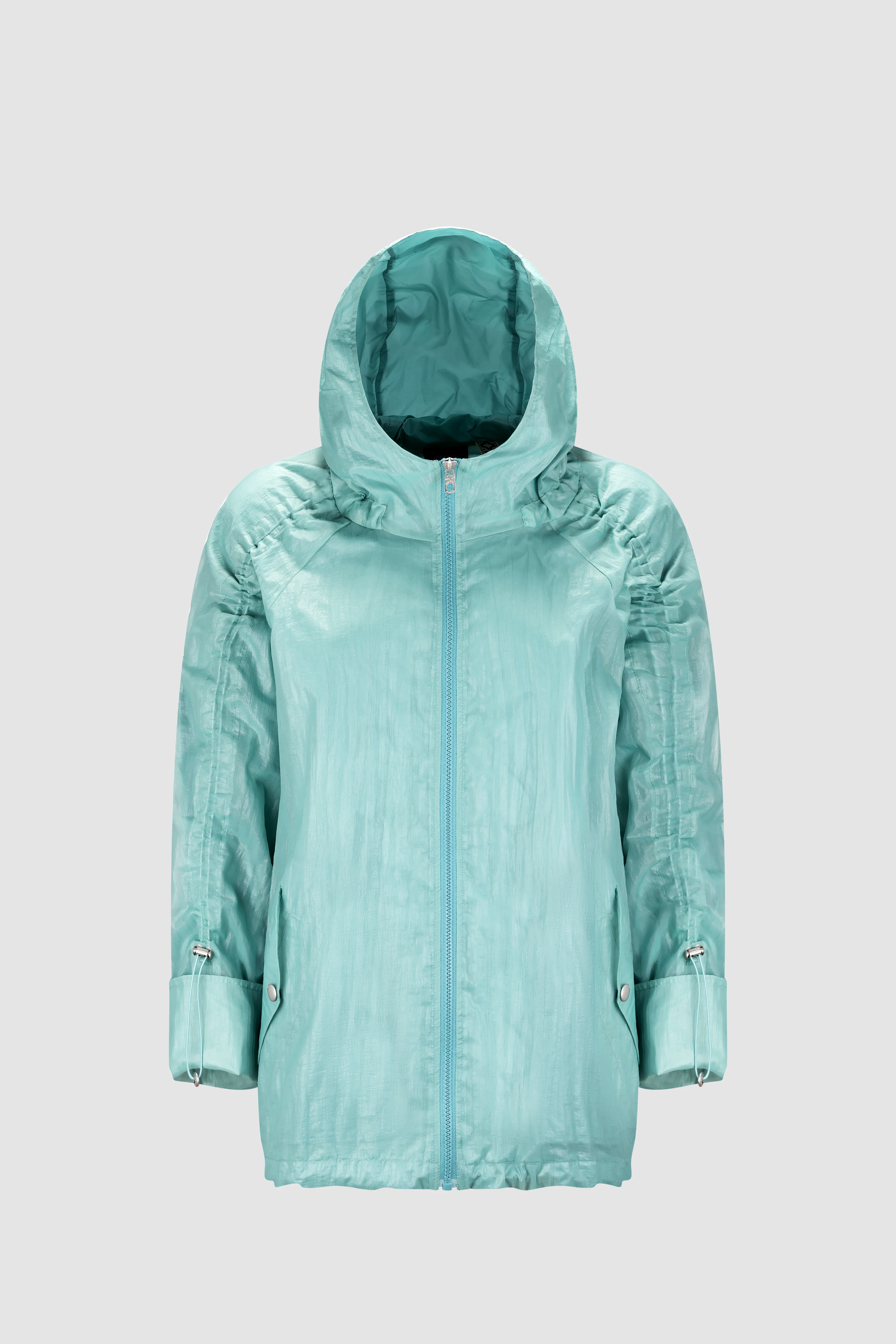 Giacca da donna estiva con tessuto esterno trasparente dall'aspetto unico. Cappuccio fisso regolabile da coulisse. Fondo giacca e maniche regalabili da coulisse per creare un look di tendenza. Zip frontale dentata, tasche con chiusura a bottone.