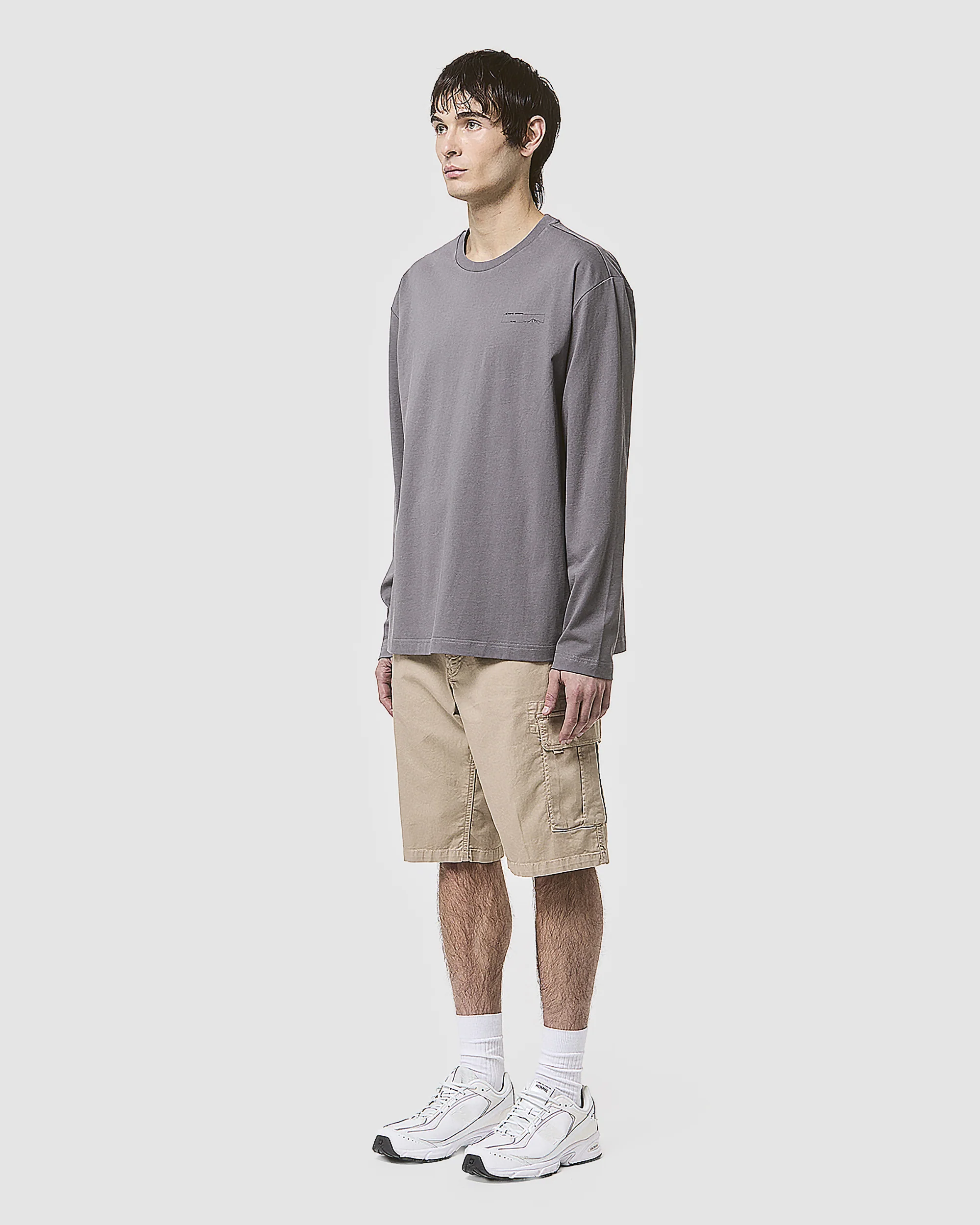 T-shirt manica lunga in heavy jersey di puro cotone tinto pezza, morbida al tatto e confortevole. Una piccola stampa personalizzata sul petto aggiunge un dettaglio distintivo senza appesantire il design. Perfetta da indossare da sola o come base per look a strati casual e contemporanei.