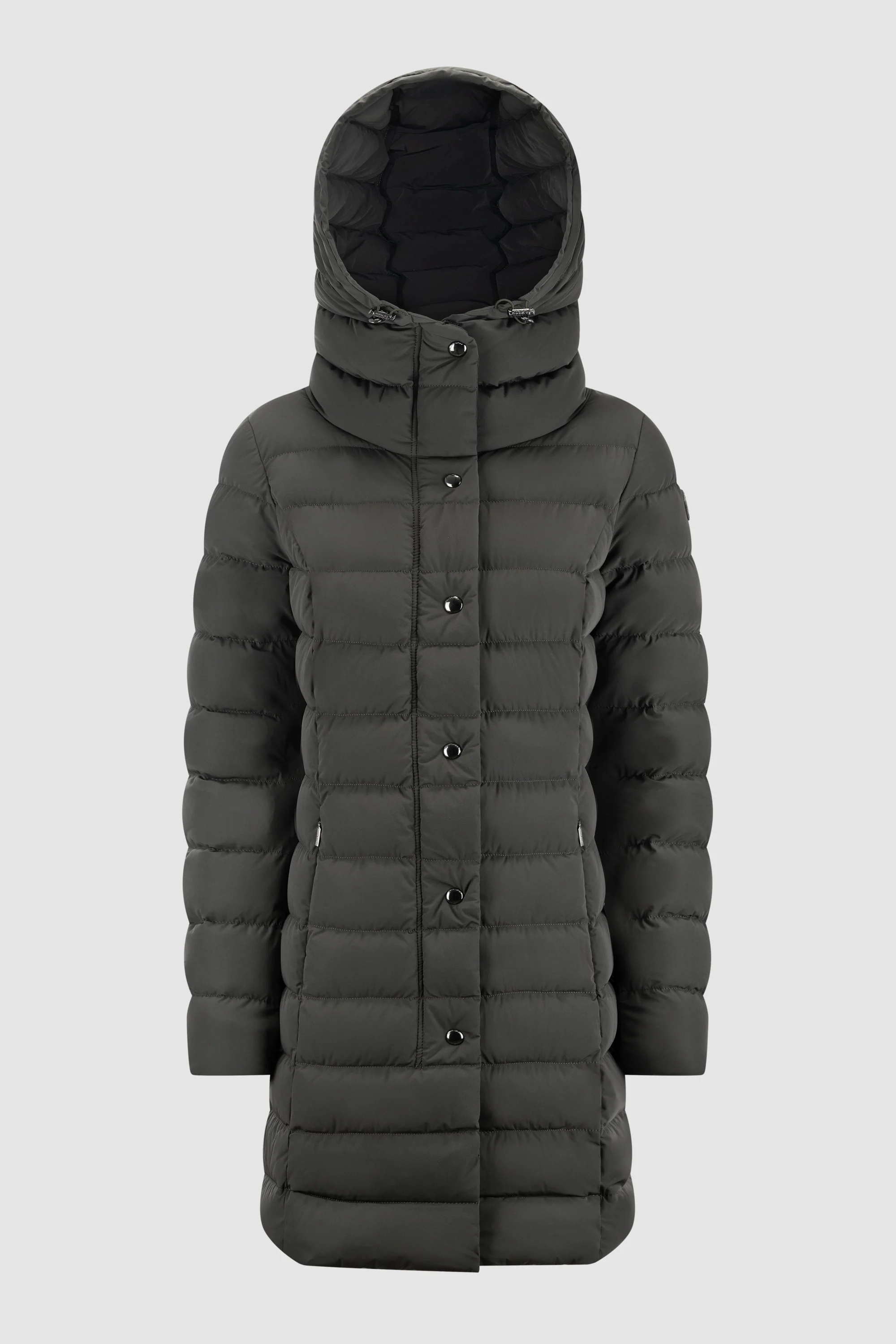 Piumino da donna trapuntato dall'aspetto opaco, realizzato in tessuto nylon elasticizzato che garantisce il massimo comfort nei movimenti. Il cappuccio fisso, dotato di coulisse di regolazione, offre una vestibilità personalizzabile e una protezione extra dal freddo. La zip centrale a spirale con doppio cursore e puller personalizzati è elegantemente nascosta da una pattina con bottoni a vista sul fronte, per un design raffinato. Le zip delle tasche invisibili mantengono un aspetto pulito e moderno, mentre una tasca interna portadocumenti aggiunge funzionalità al capo. Nei polsi 3 bottoni arricchiscono il look. Imbottito in piuma naturale certificata, questo piumino è resistente al freddo fino a -10°, rendendolo l'alleato ideale per affrontare le giornate invernali con stile e comfort.